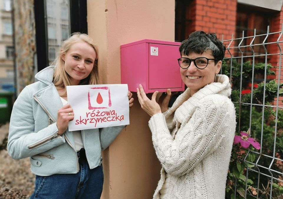 Projekt „Różowa skrzyneczka” został stworzony przez Adriannę Klimaszewską i Bożenę Powagę z Wrocławia. Jest to pudełko z darmowymi podpaskami i tamponami. Po raz pierwszy pojawił się w Centrum Praw Kobiet we Wrocławiu. W 2023 roku Różowa skrzyneczka nadal coraz częściej pojawia się w szkołach, bibliotekach, galeriach i innych miejscach publicznych.