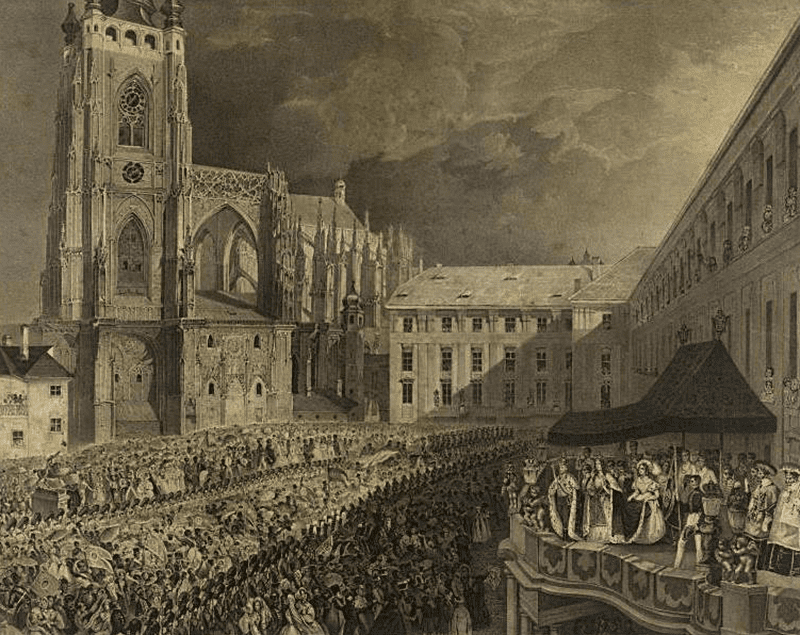 Затем венценосные супруги подошли к алтарю, где кардинал помазал их святым елеем. А когда они уселись на престолы, состоялась торжественная месса, во время которой, перед центральным алтарем Карлу Люксембургскому, именовавшегося отныне Карл IV, возложили императорскую корону. Затем короновали и Анну.
