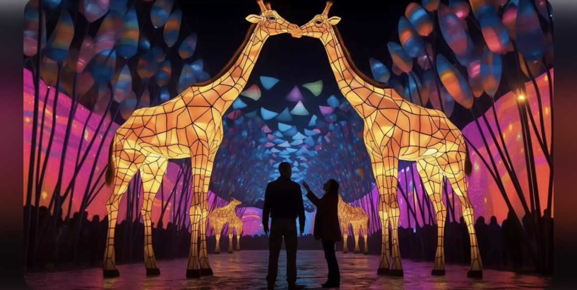 Зображення проєктуються на водну стіну, показуючи невелику кінострічку, а яскраві лазери підкреслюють динамічність показу.