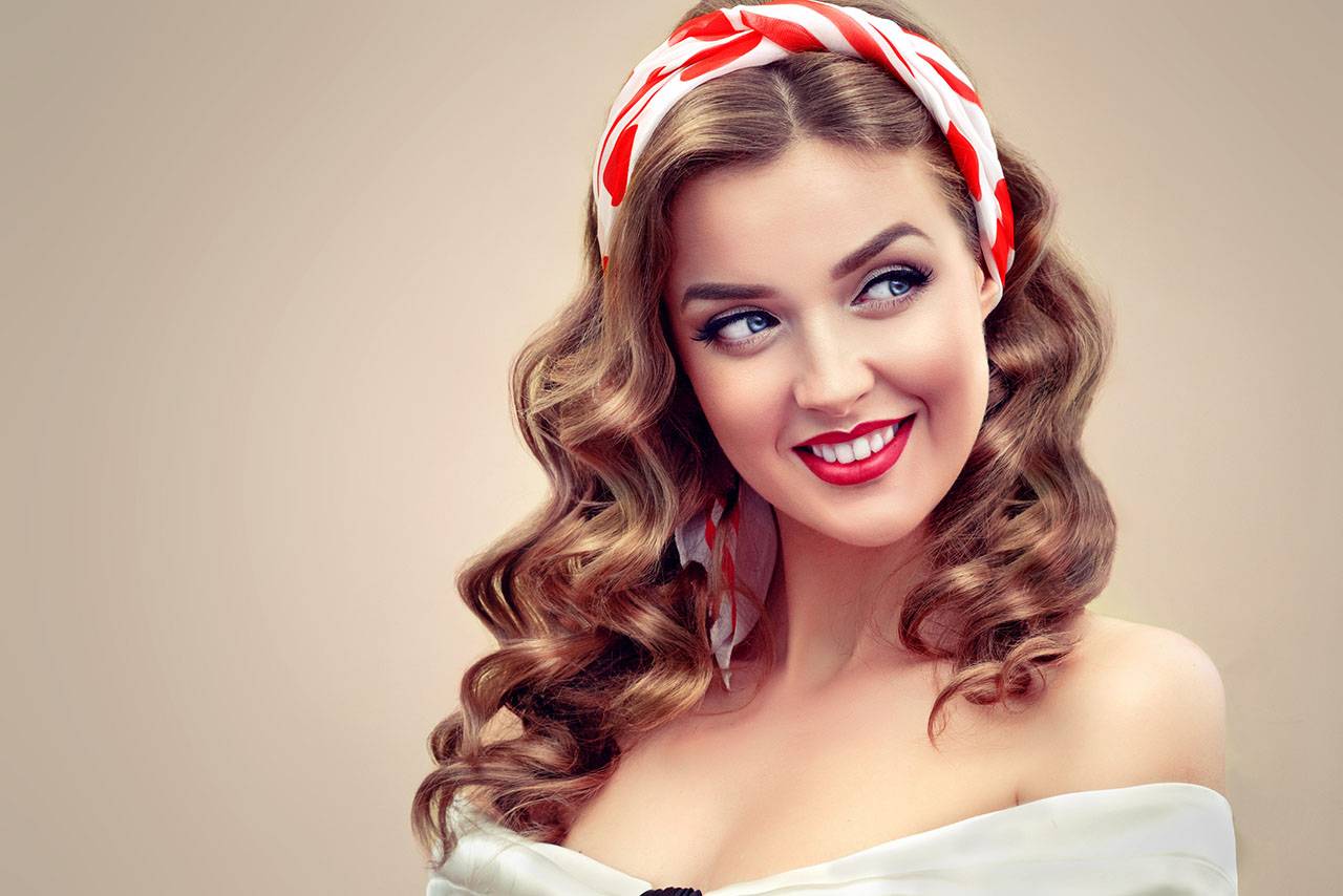 Говорячи про моду 50-х років, неможливо не згадати зачіски пін-ап з американських плакатів. Найчастіше вони асоціюються з зачісками вище шиї або високими хвостиками, рідше з розпущеними локонами. Відмітними ознаками цього стилю були короткі чубчики, локони та пов’язки, наприклад, червоні стрічки або хустки, зав’язані трохи вище чола в бант.